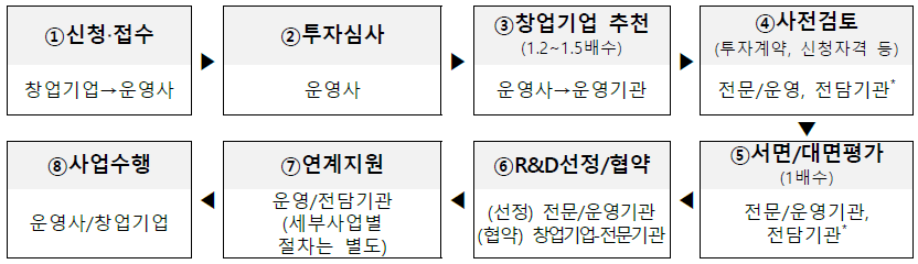 - 창업기업의 기본 신청자격, 지분 및 운영사 창업기업 간 투자계약 적절성 등 검토