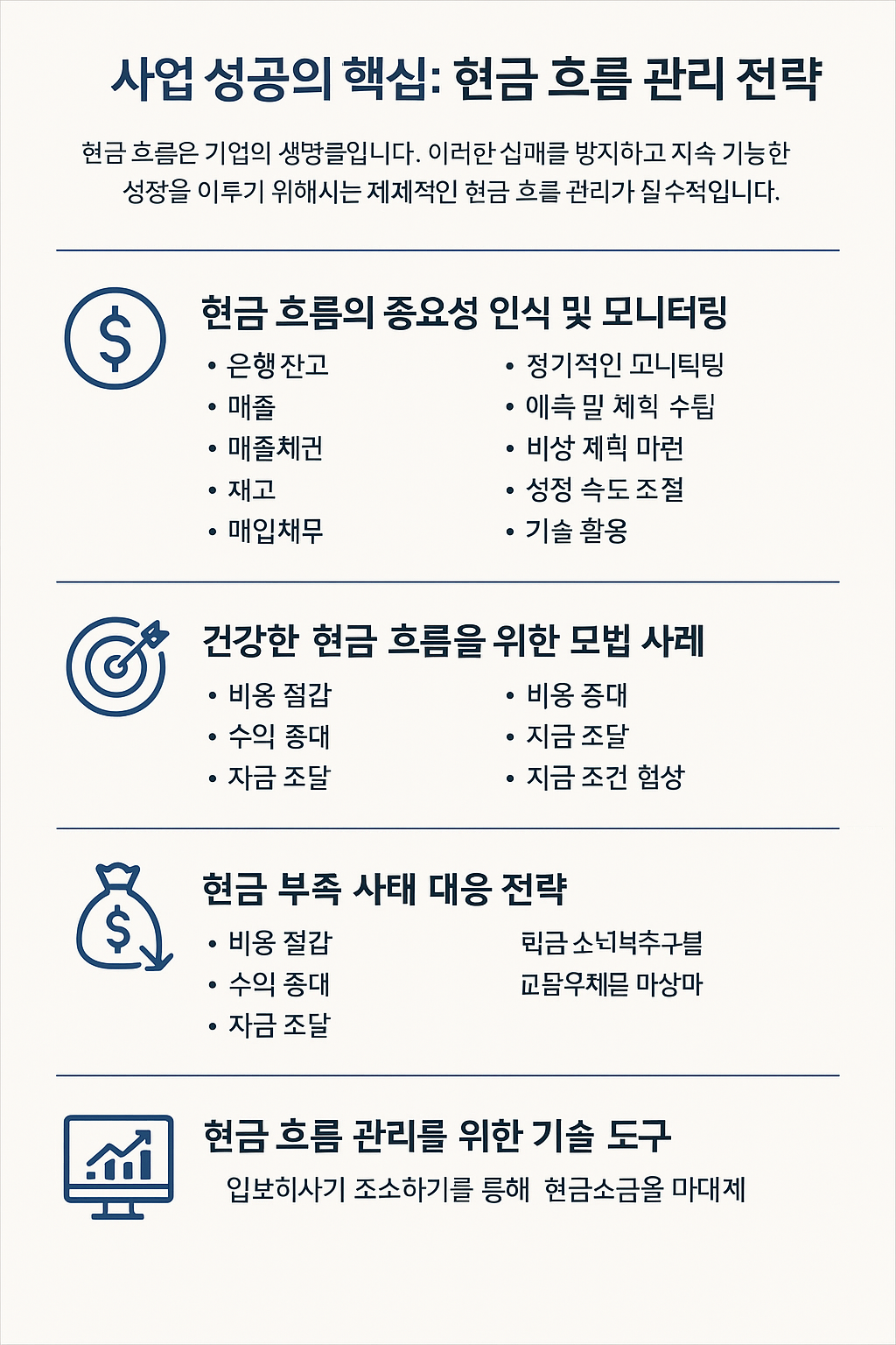 - **비상 계획 마련**: 예기치 않은 현금 부족 사태에 대비하여 비상 자금을 확보합니다.